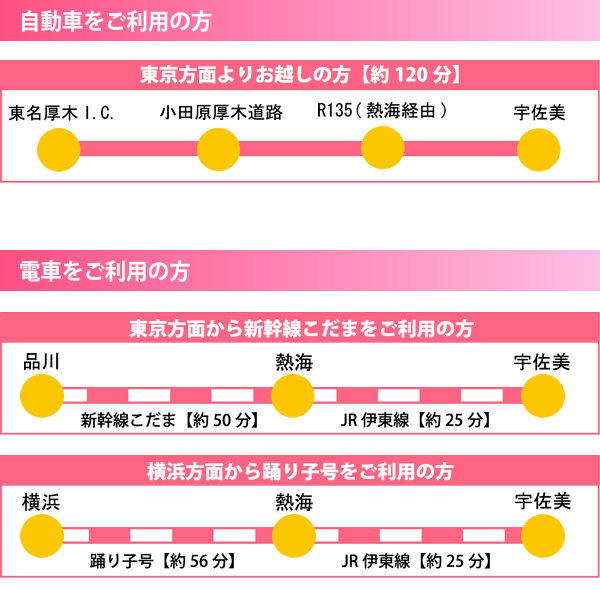 東京(新幹線こだま)―熱海 (約50分)―熱海(JR伊東線へ乗り換え熱海)―宇佐美(約25分)
