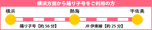 横浜(踊り子号)―熱海(約56分)―熱海(JR伊東線へ乗り換え)―宇佐美(約25分)