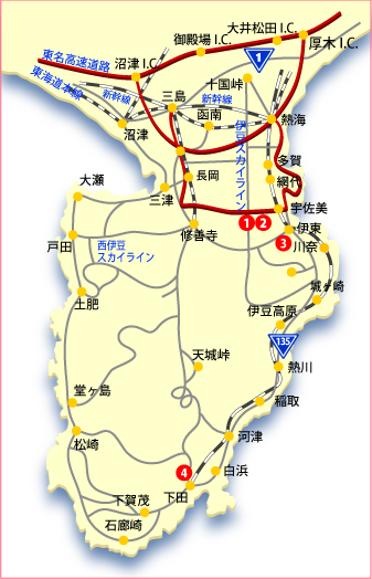 ■東名高速―厚木IC(小田原厚木道路)―小田原西IC―箱根新道or箱根ターンパイク―箱根峠IC―熱海箱根峠―熱海峠IC―伊豆スカイライン―亀石IC―宇佐美